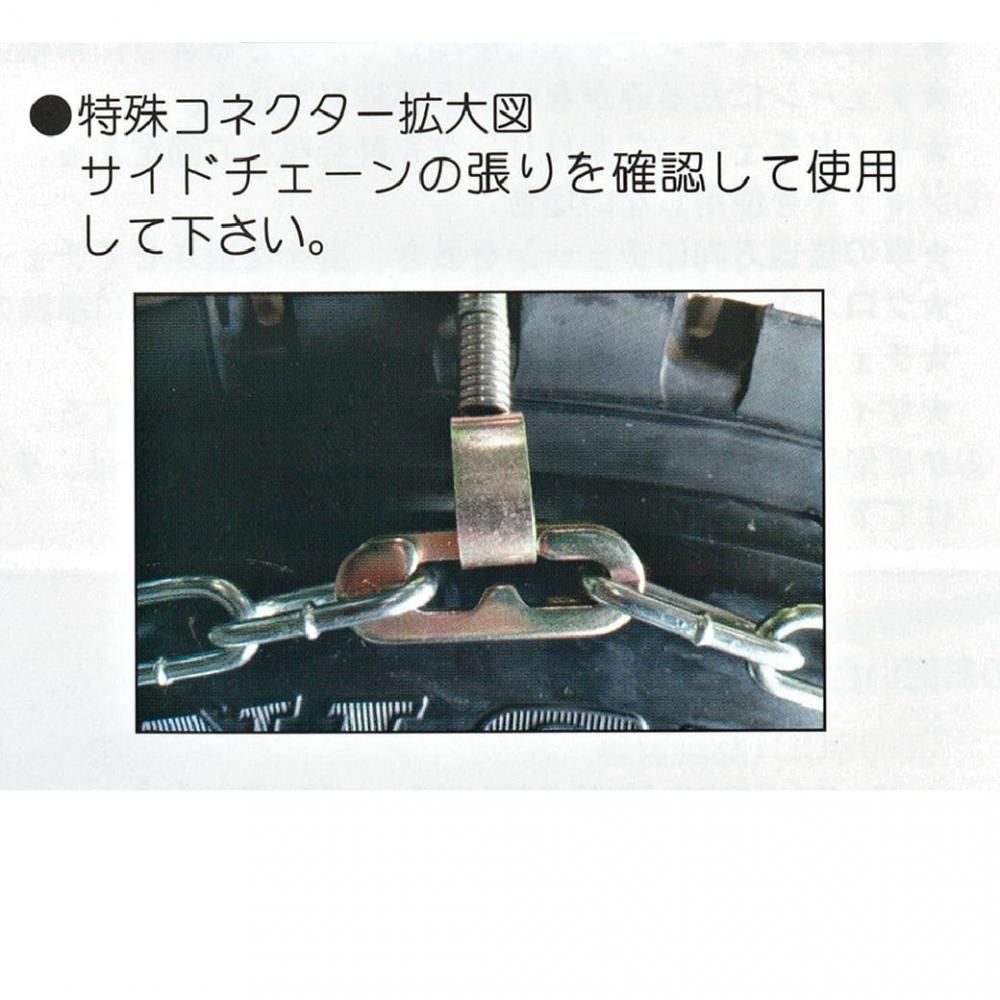 タイヤの側面に使用しているサイドチェーンは耐久性のある「スチールチェーン」を使用し、地面と接触するクロスチェーンは特殊ワイヤーに合金鋼コイルスプリングを装着。一般的な鎖状チェーンと違い、コイルスプリング部分が回転しているため、片減りせず全体が均一に摩耗、長寿命を実現。(鎖状鉄製JISチェーンに比べ約2倍)